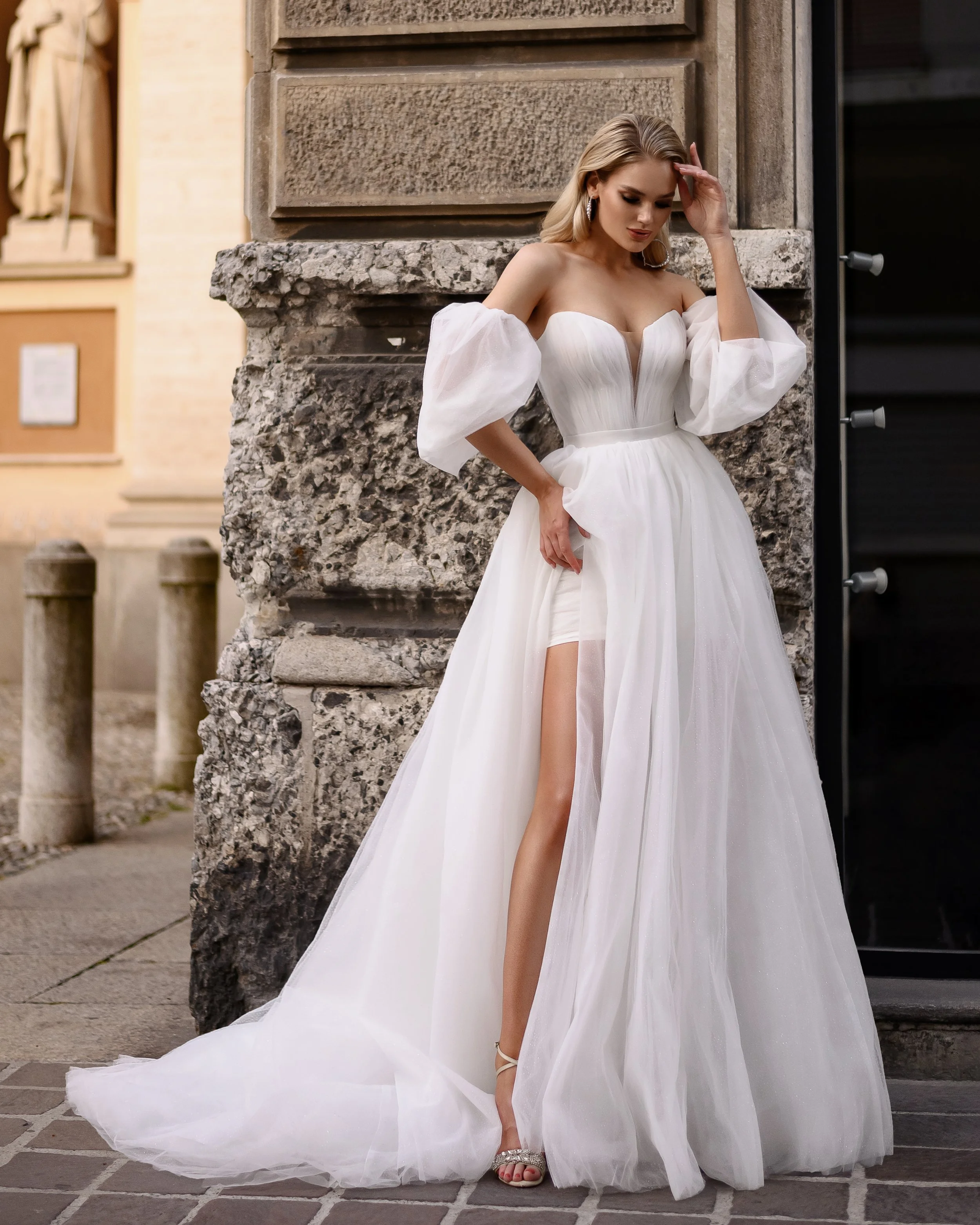 Incredible transformative dress with interesting detachable details. A fairytale tulle a-line dress with a deep V-neck, which transforms into a sexy & fun mini! Available for purchase with or without the detachable overskirt & puff sleeves.